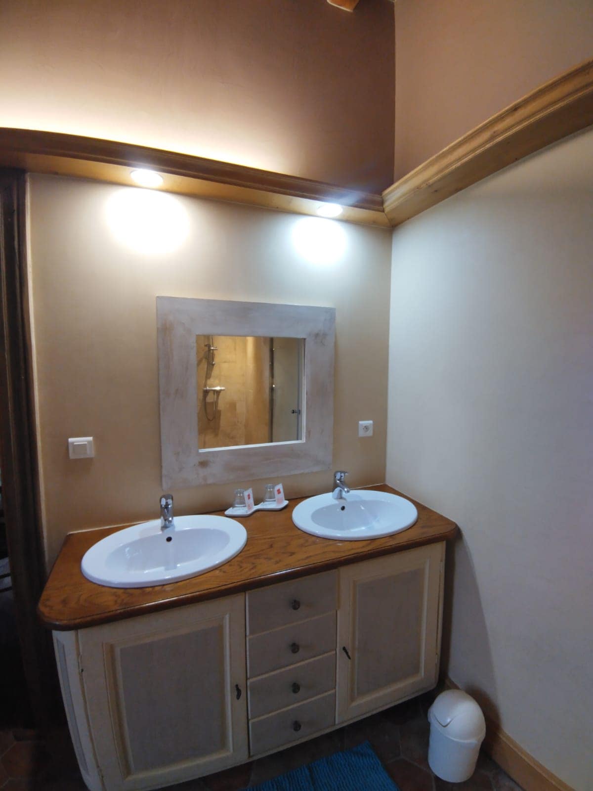 Photo claire mais cadrage un peu étroit, mise en valeur des lavabos double mais pas d’accessoires visibles.