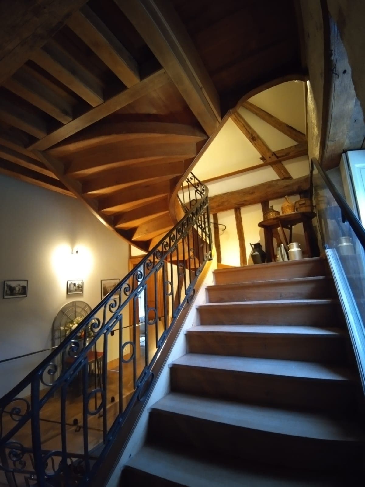 Photo met bien en valeur la structure ancienne avec poutres apparentes, éclairage correct mais manque de chaleur.
