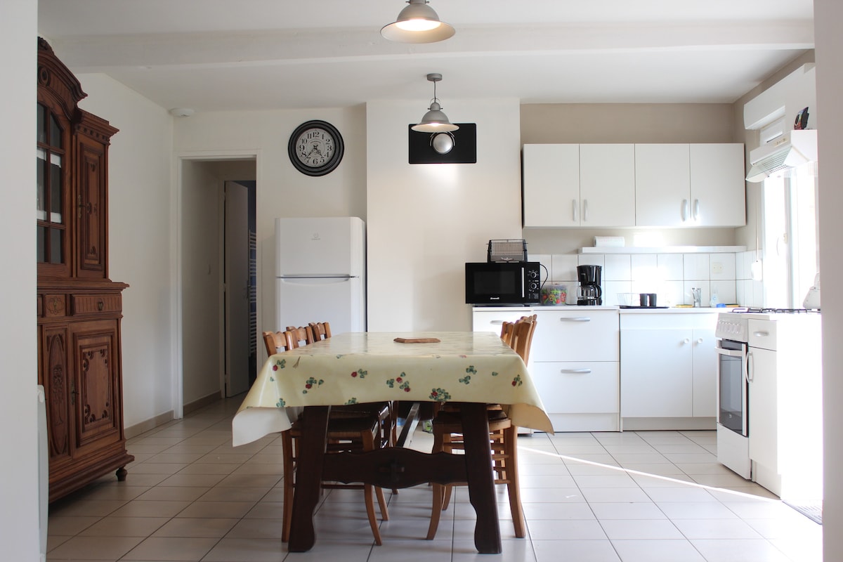 Photo claire, montre bien l’espace cuisine et salle à manger.