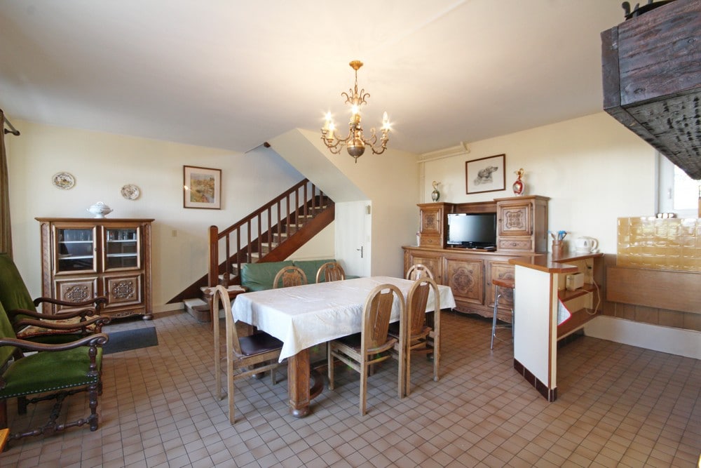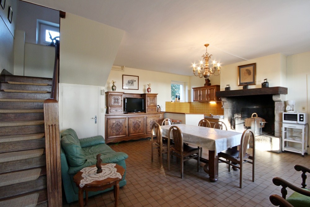 Photo similaire à la précédente, bonne visibilité du coin repas et de la cheminée.