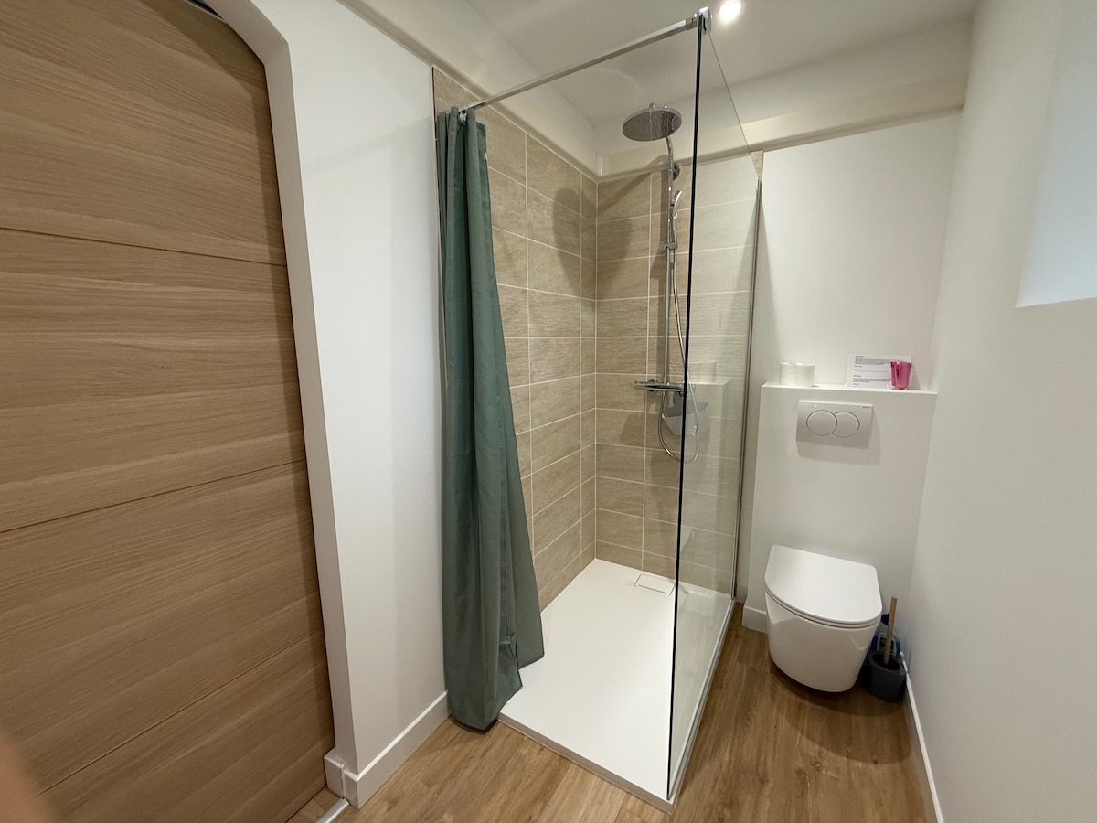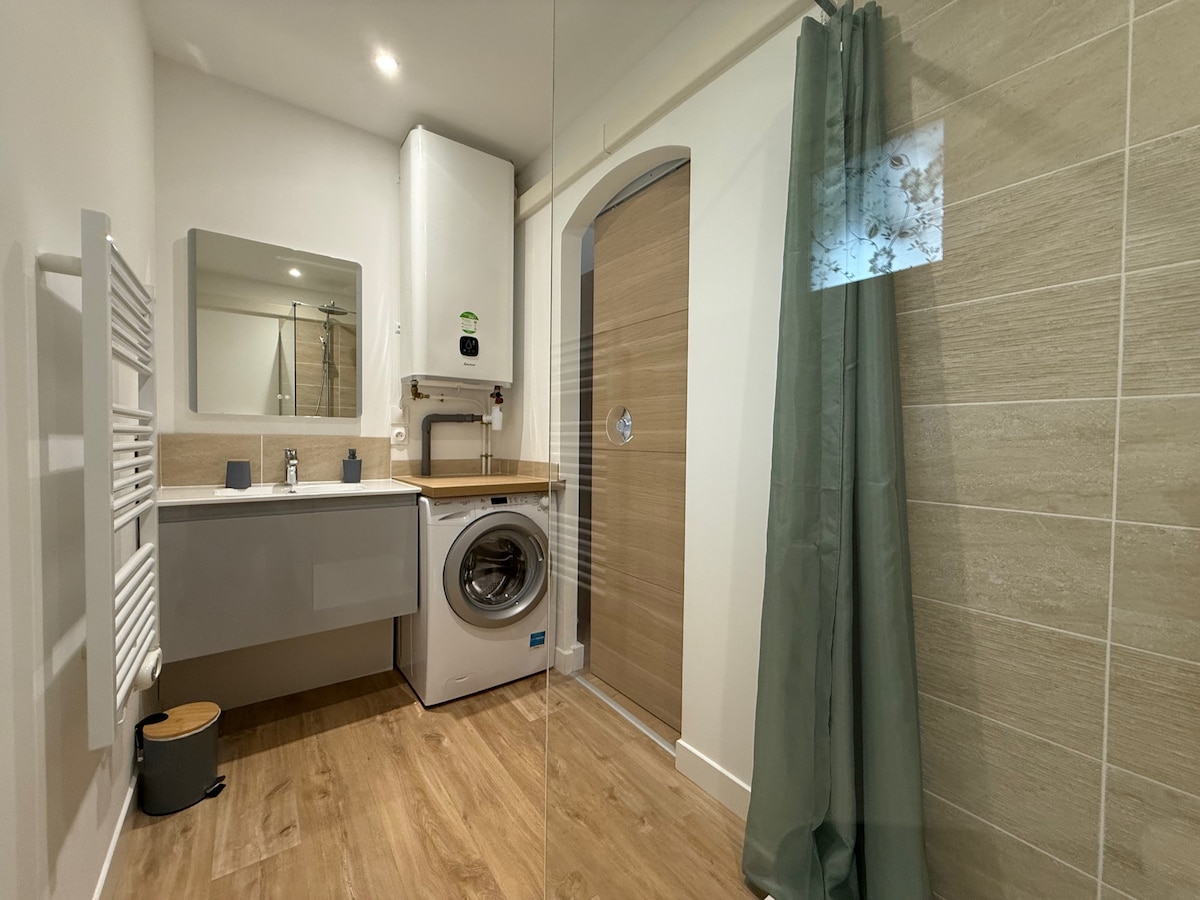 Photo complémentaire de la salle de bain avec lave-linge visible, pertinent.