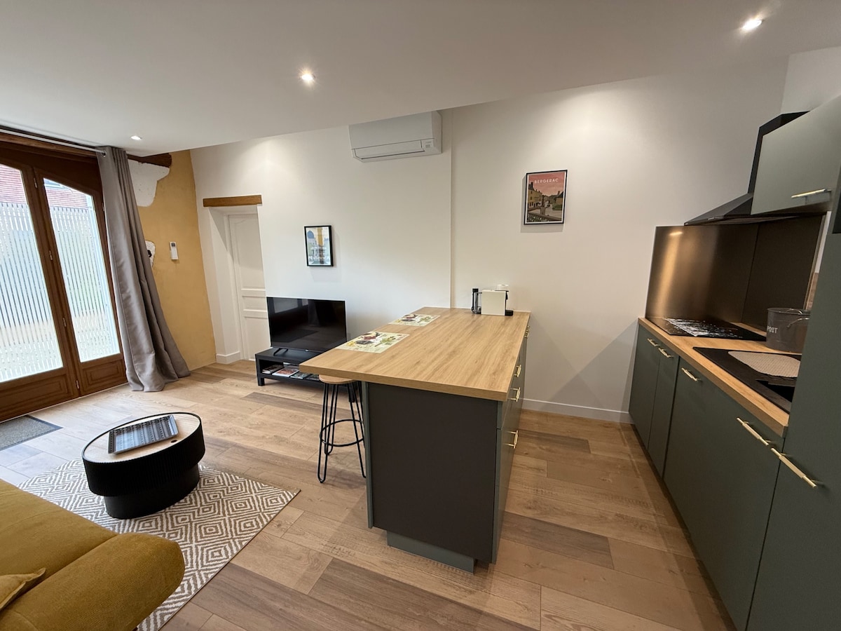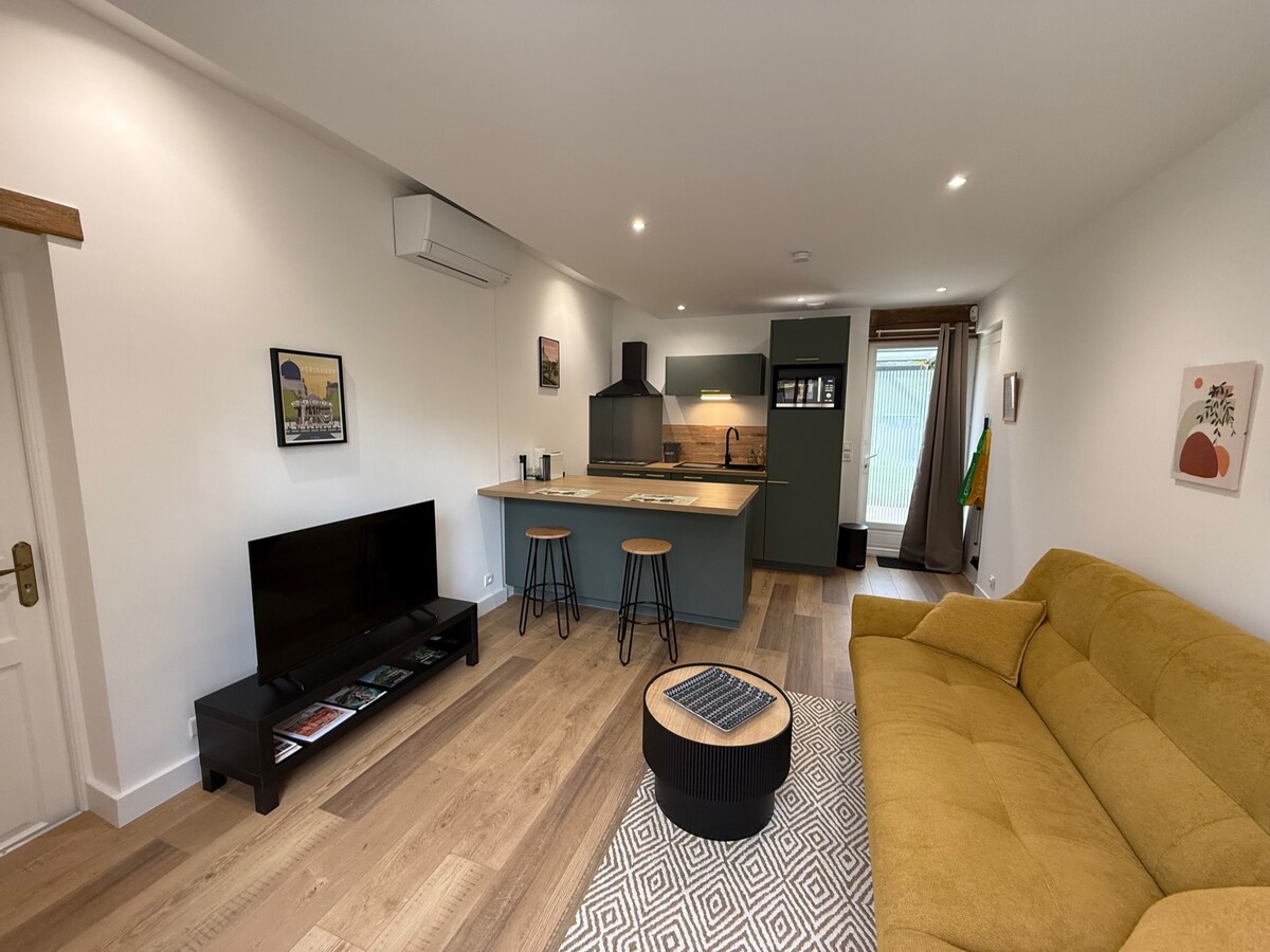 Photo principale très attractive, lumineuse et nette, bien cadrée montrant le séjour et cuisine moderne et fonctionnelle.