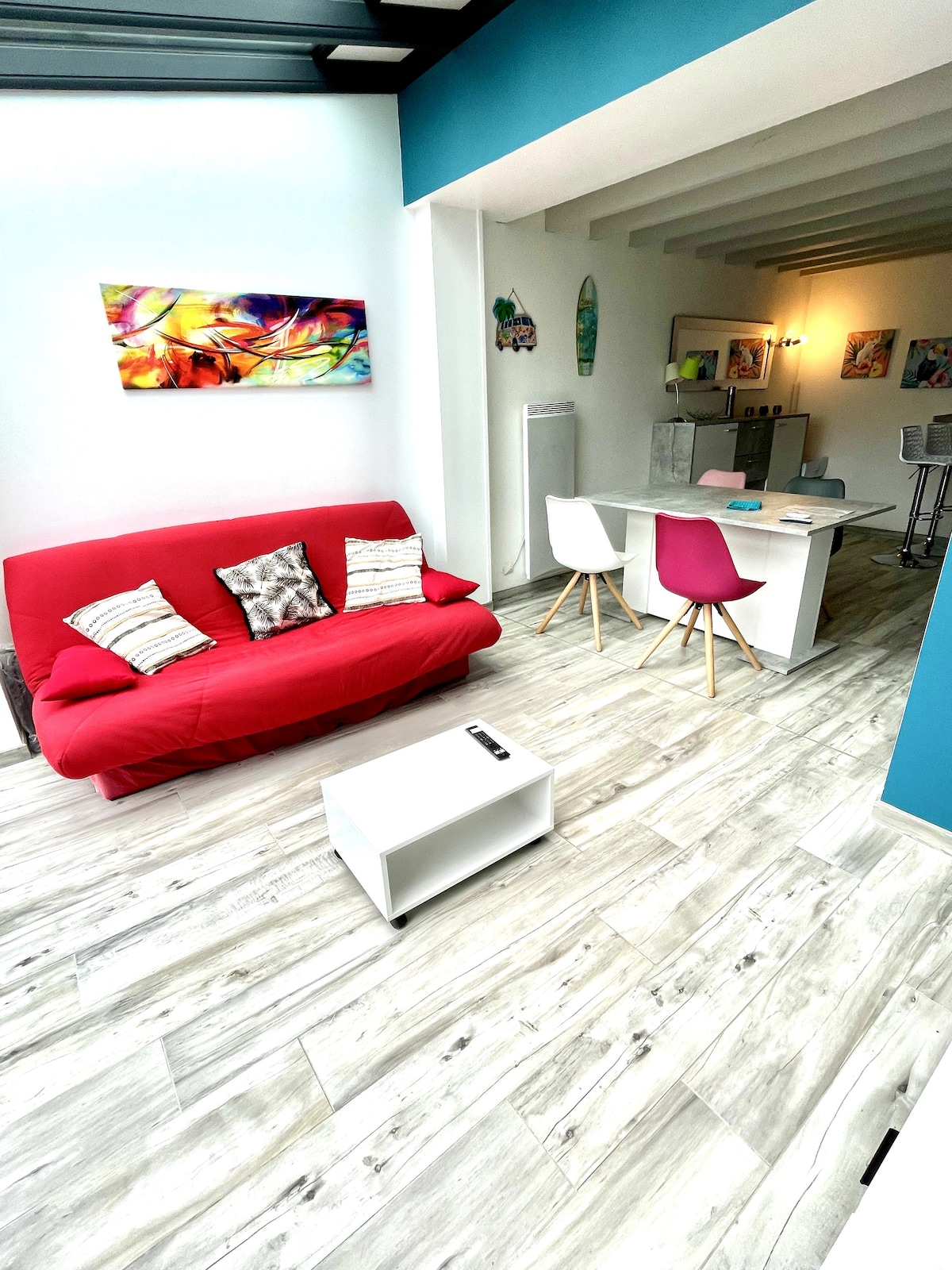 Photo lumineuse, bonne composition montrant espace commun fonctionnel, accueil chaleureux grâce au canapé rouge.