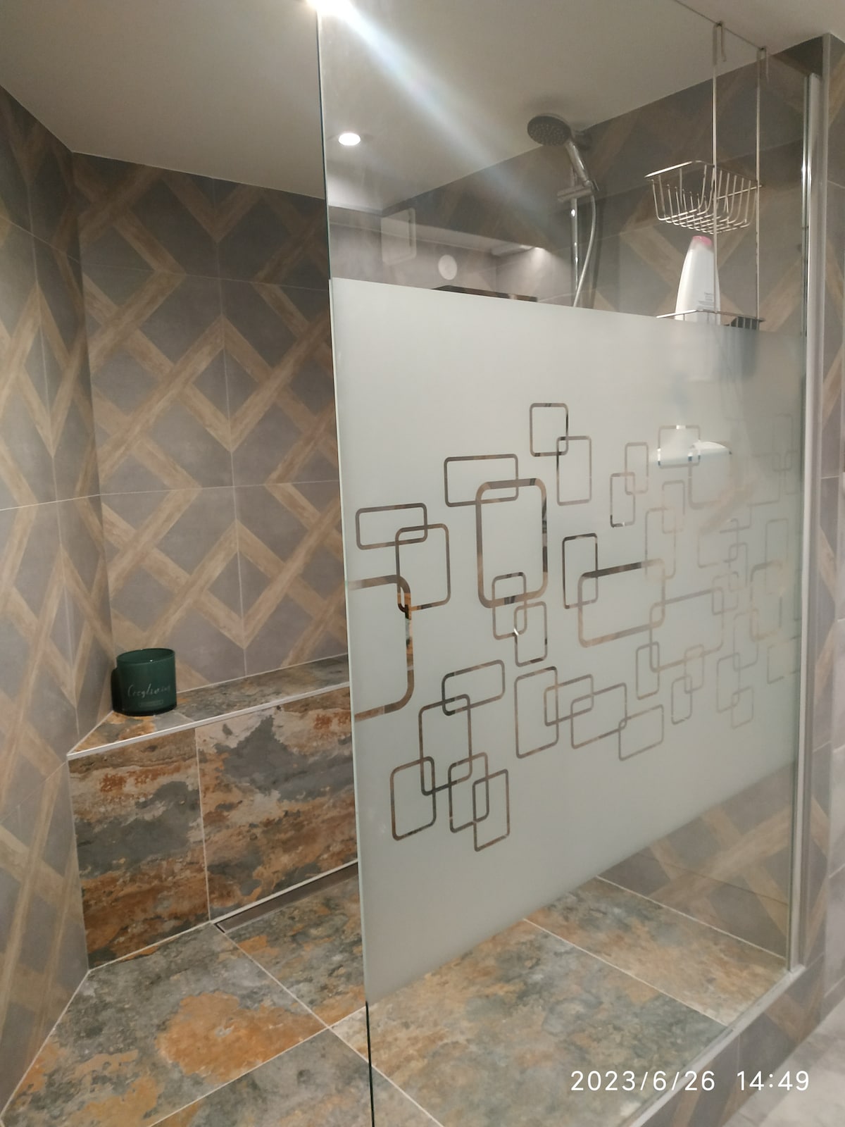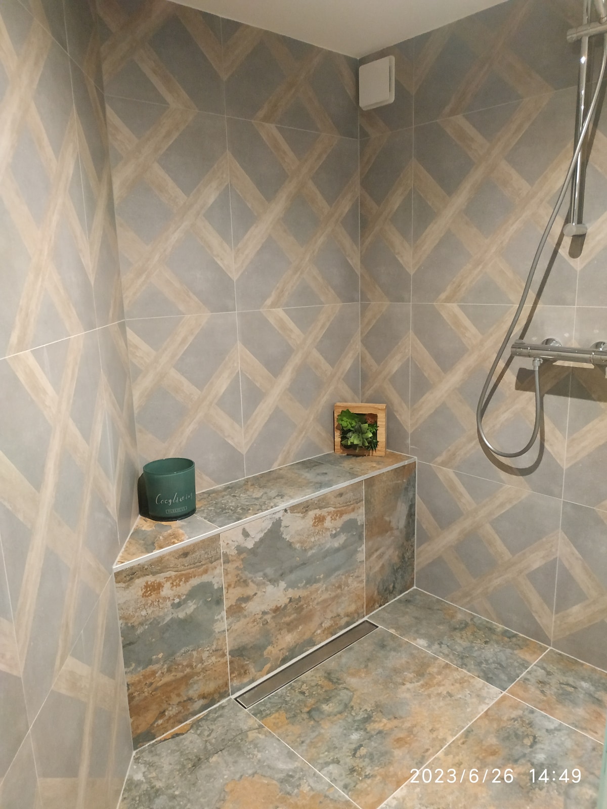 Bonne photo de la douche avec une autre perspective, plus immersive pour le visiteur.