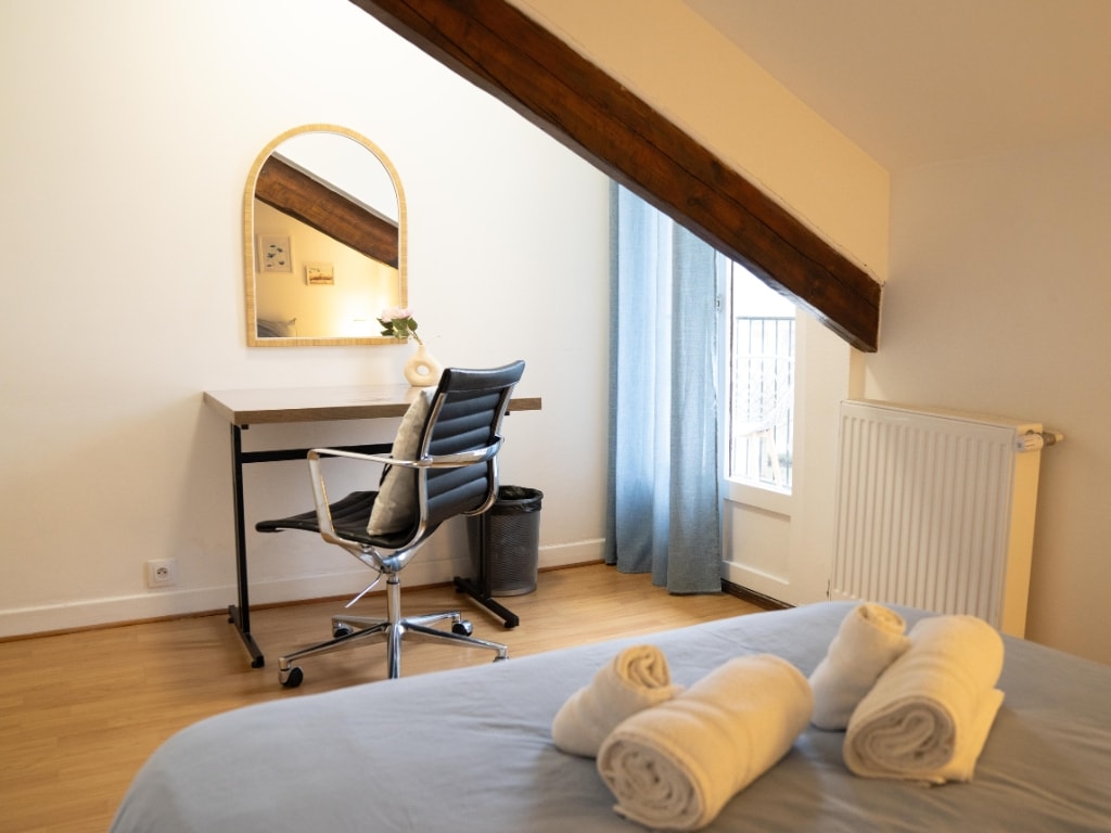Photo lumineuse, bien cadrée, met en valeur à la fois chambre et espace bureau.