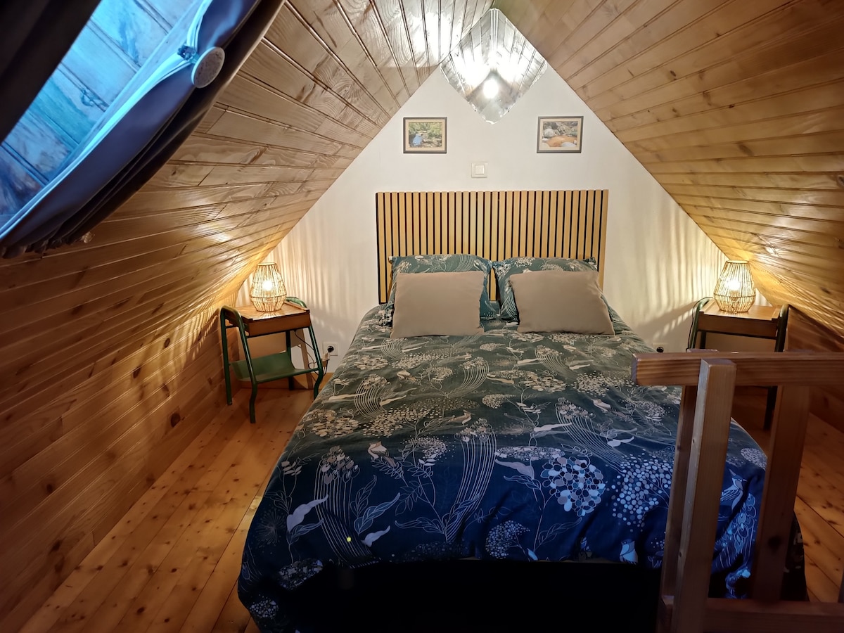 Photo montrant la chambre à l'étage, ambiance cocooning, bonne luminosité.