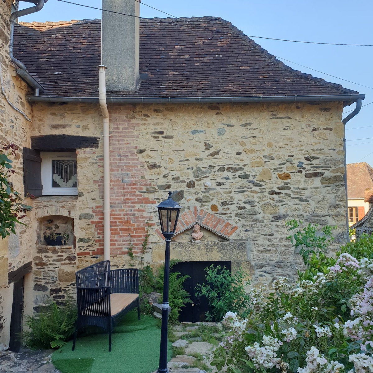 Photo extérieure atypique avec banc et décoration, bien mais pourrait être plus lumineuse.
